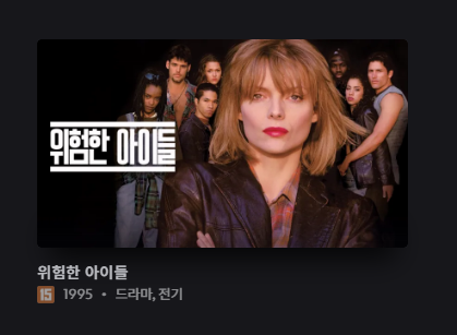 위험한 아이들(원제 : Dangerous Minds)은 1995년 작품으로 미셸 파이퍼가 주연하고 존 N. 스미스가 감독인 교육에 관한 해당 시대의 현실적인 내용을 담고 있는 영화입니다. 옛날 영화는 종종 찾아서 보는 편인데도 이 영화는 존재 자체도 모르고 있다가 간간히 TV 채널을 돌릴 때면 나오는 '전기현의 씨네뮤직'이라는 프로그램을 보면서 처음 알게 된 영화입니다. 평소에도 음악이나 영화를 좋아해서 해당 프로그램은 TV 채널을 돌리다가 - 0번부터 끝까지 가끔 돌려보는 습관이..- 방송을 하고 있으면 옛날 편이든 요새 편이든 틀어놓고 보는 편인데 이 영화가 나온 회차를 재방송할 때 틀어놓았다가 음악도 음악이지만 소개해주는 스토리가 마음에 든 편이라 한번 봐볼까 하고 생각하고 있던 차에 현재 구독하고 있는 OTT 중 하나인 디즈니 플러스에 이 영화가 있길래 OTT로 시청했습니다.